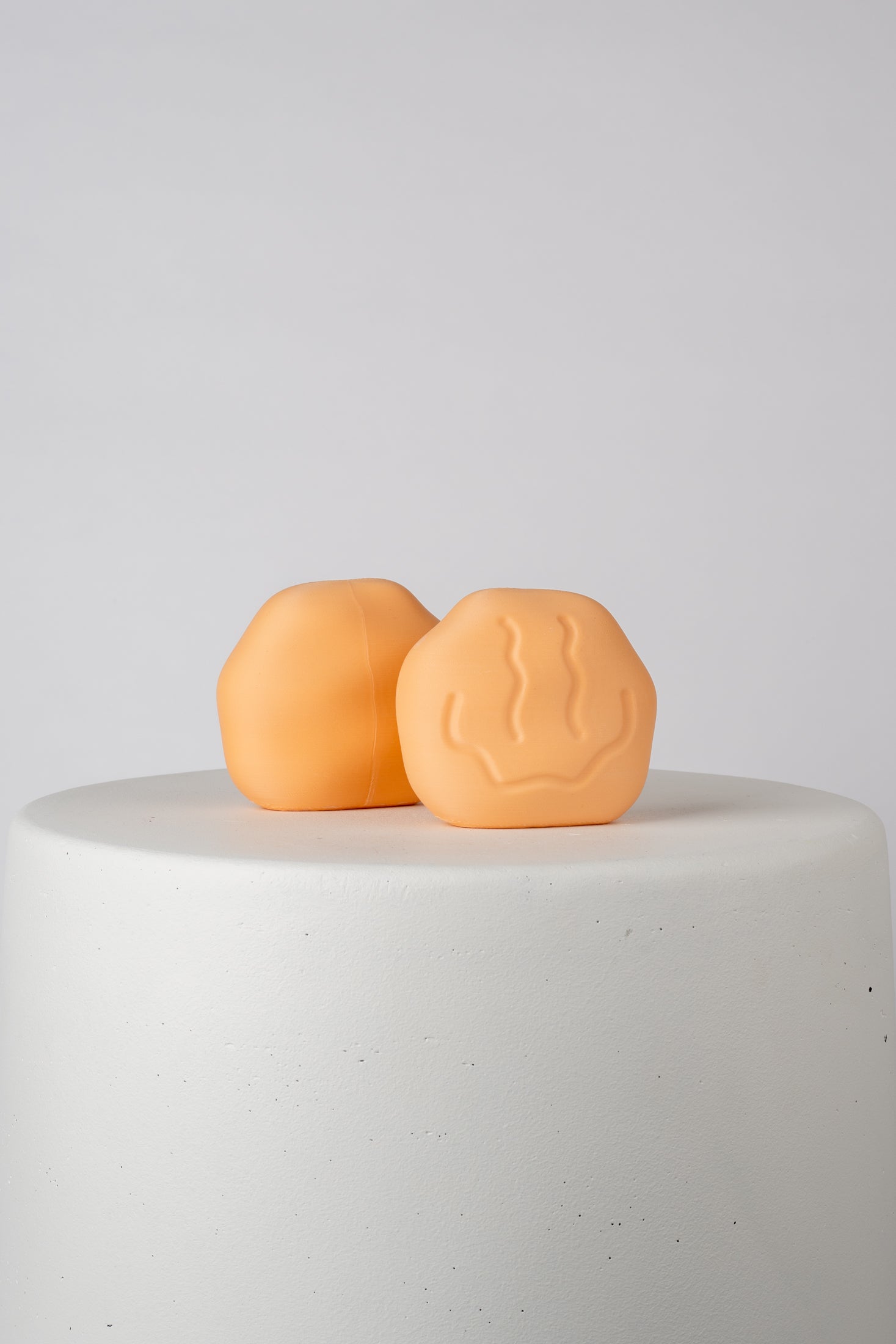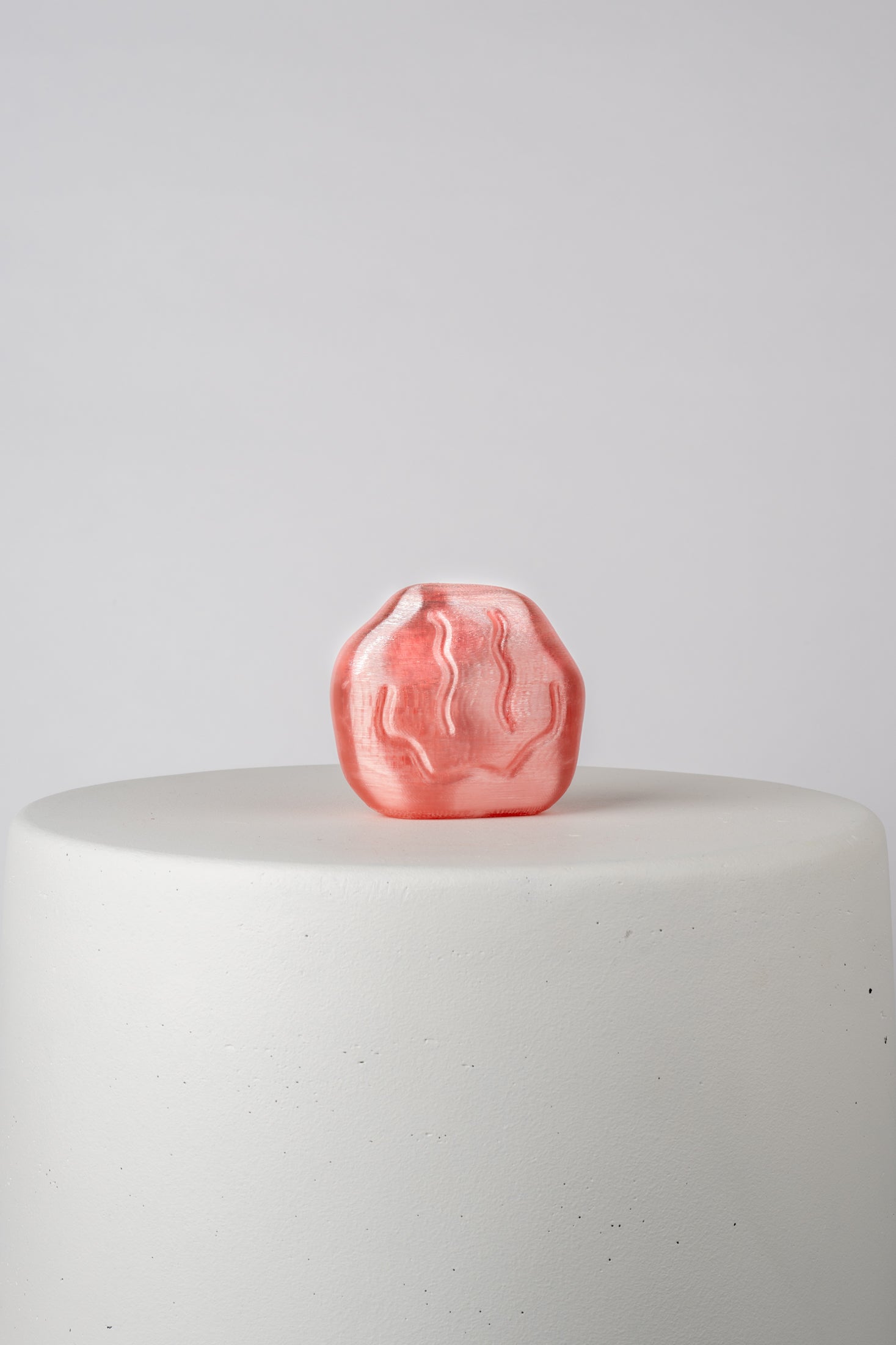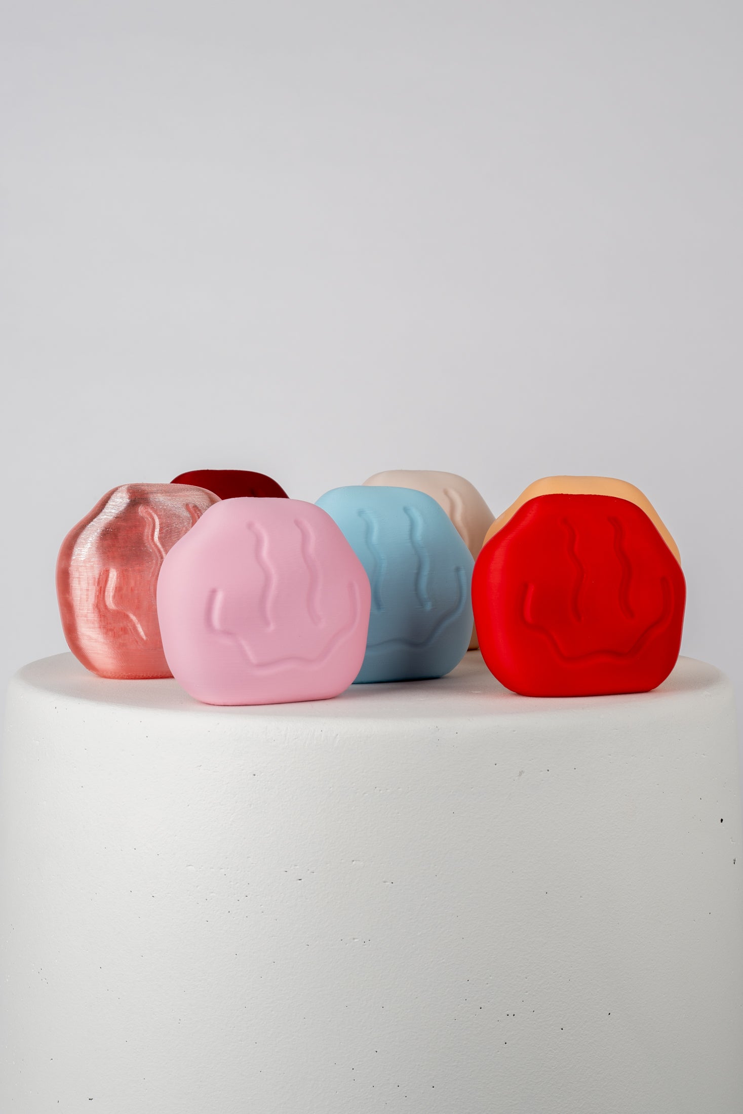 These are 3d-printed, all color variations are made of PLA, except for the pink shiny one which is made of PETG. They are fully recyclable, and SUPER CUTE. Hold one in your hand and you will instantly feel better.
